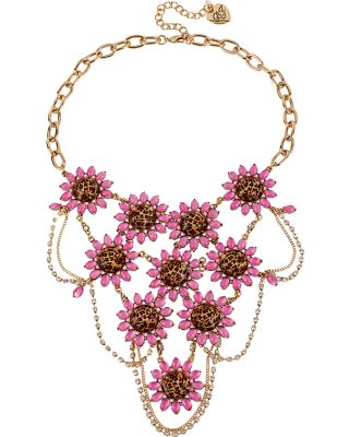 Exotic flowers from Betsey Johnson. This bib necklace combines pretty pinks with wild leopards, glass accents and crystal cup chains.