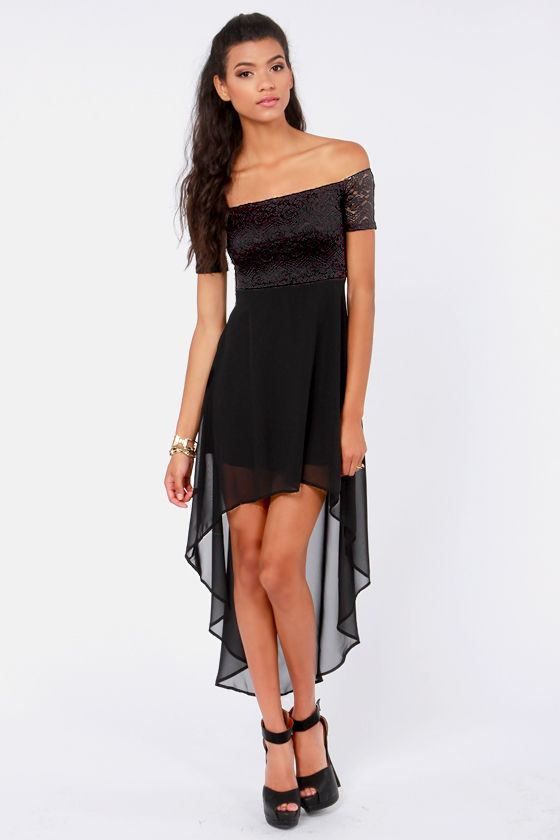 Prepare yourself for the most elegant entrances and gorgeous good-byes with the Kiss on the Chic Black Off-the-Shoulder Dress. Stretchy knit lace forms a fitted bodice that rests cutely off the shoulders with fitted sleeves. A-line skirt drifts to a stunning high-low hemline.