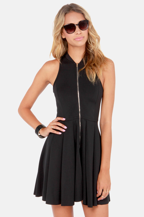 All it takes is a quick twirl to show off the full potential of the Tilt-a-Twirl Sleeveless Black Dress. An exposed zipper runs down the front of this thick scuba knit skater dress with a mandarin collar and sleeveless cut to boot. A few pleats tuck into the waist of a fun full skirt with convenient front pockets.